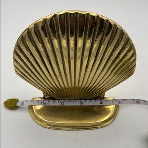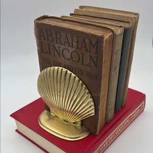 Vintage 1970’s solid brass seashell/clamshell bookends. Hollywood regency style. Perfect for adding a touch of luxury to your bookshelf. Original patina but could be shined up if you prefer. Measure approx 5-1/2” tall x 5” wide. Excellent vintage condition.