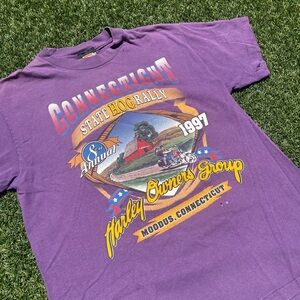 Very cool Vintage ‘97 Harley Davidson Connecticut Hog Rally Purple Shirt, single stitch tee with a dual sided print and a comfortable feel.