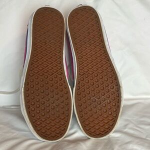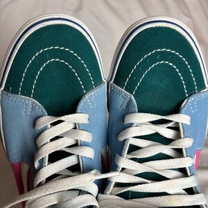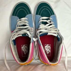 Stylish Vans high-tops in blue, pink, orange, and teal. Perfect for skateboarding! In great condition!