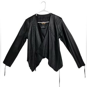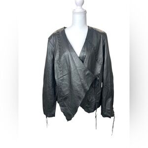 Extremely rare vintage Harley Davidson buttery soft black genuine leather jacket with asymmetrical hem in women’s size XL. Features leather stitching details and a draped wrap silhouette with leather string ties. Tag says that the jacket was made in 2001.