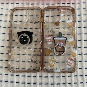 Stylish transparent phone case featuring a charming coffee cup design. Perfect for coffee lovers who want to protect their phone with flair. Second design has moon and stars with a black cat phone grip.