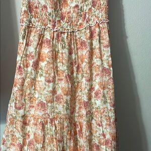 Charming floral top with puff sleeves. Features a smocked waist and a square neckline. Perfect for a casual day out.
