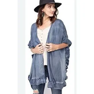 Canvas Washed Denim Ruffle Open Cardigan Size L boho western