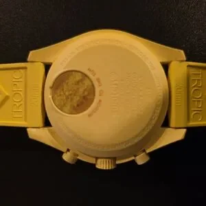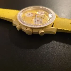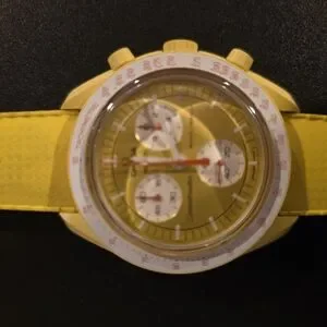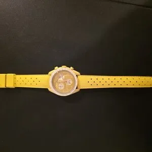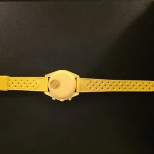 Stylish yellow chronograph watch with a bold design. Features a white bezel and multiple dials.