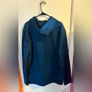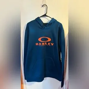 Stylish Oakley hoodie in blue with a bold orange logo. Perfect for casual wear.