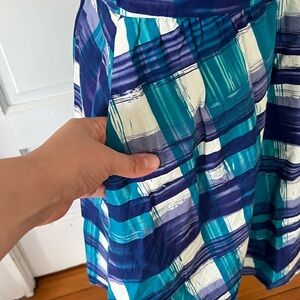 Fit and flare dress from Modcloth with painter stroke plaid pattern, functional pockets, and cute cut-out in the back.