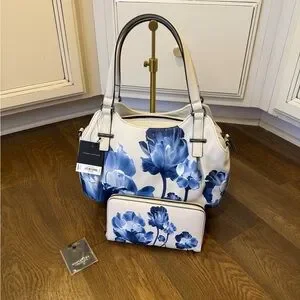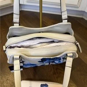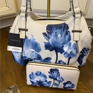 New with tags from Simply Vera Wang. Shoulder bag and matching wallet made from vegan leather. Shoulder bag original price $60 and wallet $30. Elegant handbag set featuring a stunning blue floral design on a white background. Long crossbody strap included. Perfect for adding a touch of sophistication to any outfit.