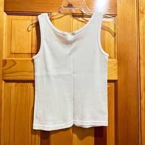 This fitted white tank top features a ribbed texture and a sleeveless design, making it a versatile addition to any wardrobe. Its clean, bright white color and classic round neckline offer a timeless look, perfect for layering or wearing alone.