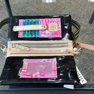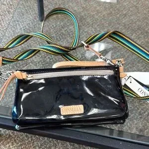 Included detachable wristlet strap and adjustable woven crossbody strap