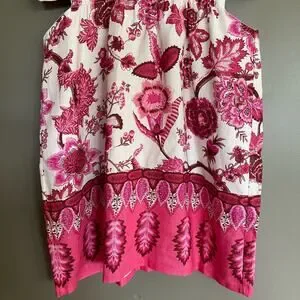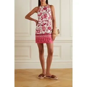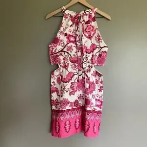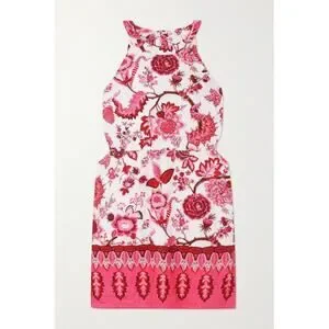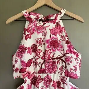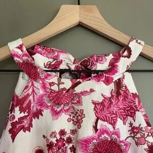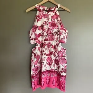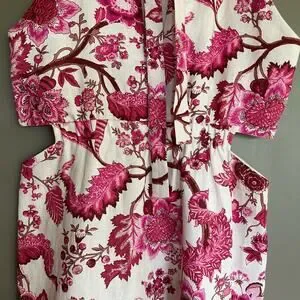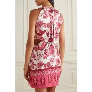 CARA CARA Savannah Cutout Floral-print Linen Mini Dress In Pink, Size Medium, Sleeveless, High neck, Ties at Back of Neck, Cutouts at Waist, Mini Length, Ivory Off White with Pink Red Brown Floral Paisley Botanical Print, 100% Linen, In like new condition with no flaws or signs of wear.