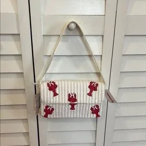 Chic and playful, this cream bag features vibrant red lobster embroidery. Perfect for adding a touch of fun to any outfit.