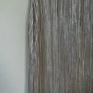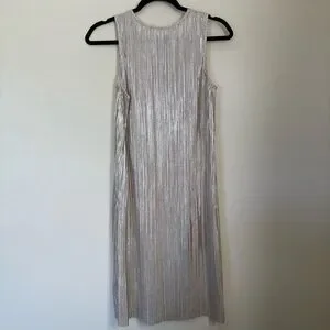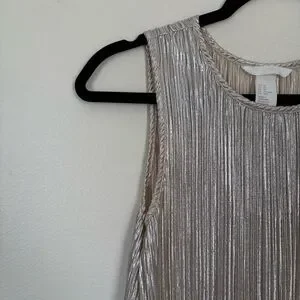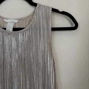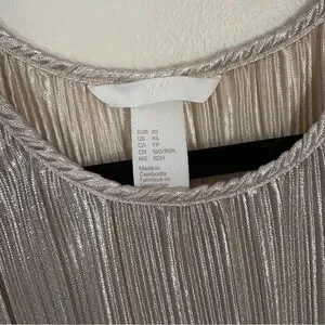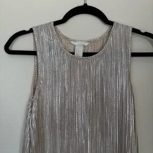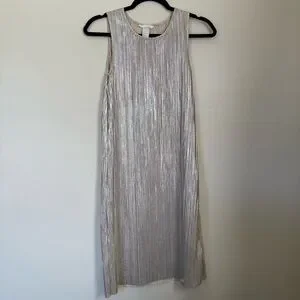 This stunning H&M dress features a sleeveless design with a crew neck, perfect for cocktail parties or as a wedding guest. The pleated texture in a shimmering silver-gold hue adds a touch of elegance. Its midi length ensures a sophisticated look for any special occasion. Size extra small. Excellent condition. Worn once for a flapper costume!