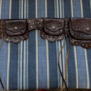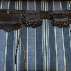 This is a festival belt beautifully crafted by Naytures Empire. Brown leather and bronze findings. Has 3 snap pockets in front and on the inward side 3 zipper pockets. Never worn because it did not fit. I'd say it's small and would fit a 30-36 inch waist.