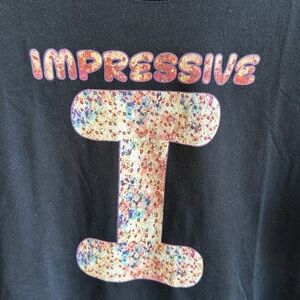 Black “Impressive I” T-shirt, size L (guessing; no labels; see measurements below). Soft, medium weight fabric. Good preowned condition.