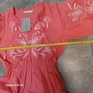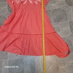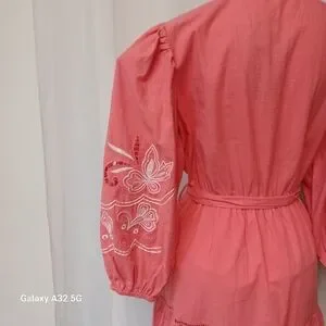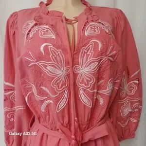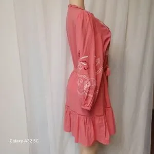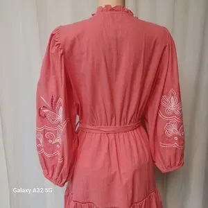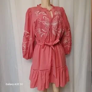 SEE AND BE SEEN. SIZE M Chic and stylish pink coral 3/4 sleeve dress boho large dress with intricate embroidery. Perfect for any occasion.This image shows a Coral 3/4 Sleeve Dress featuring white embroidery, a ruffled collar with tassel ties, and a cinched waist with a detachable tie belt.