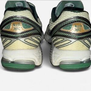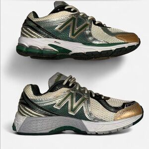 The New Balance 860v2 Aime Leon Dore Green is dressed in green, and sea salt accents that also have metallic gold and silver trim alongside what seems to be modified tongue branding.