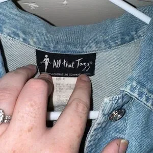 Keywords: vintage maxi dress, All That Jazz, 90s fashion, floral pattern, denim dress, sleeveless, V-neck, casual spring dress, multicolor, women's fashion, USA made, pre-owned, garden party dress, brunch outfit, vest-style top.