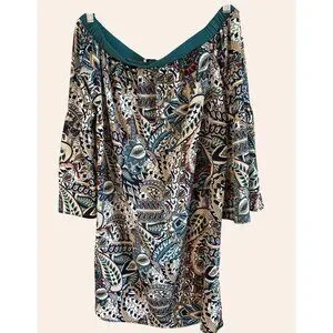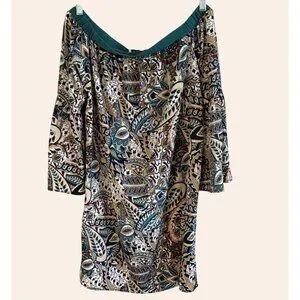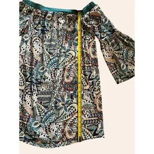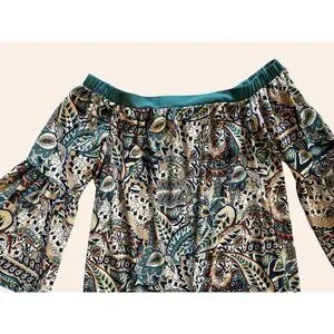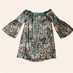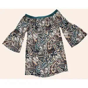 NWOT New Glam American Made Off-Shoulder Boho Print Dress Bell Sleeves Size S