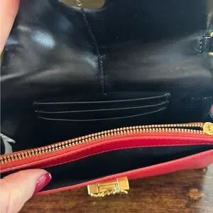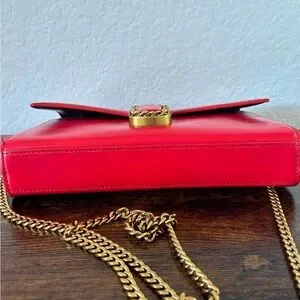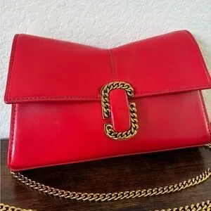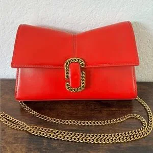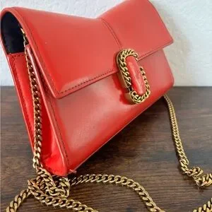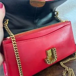 Marc Jacobs Crossbody Wallet Bag in Cherry Red with Gold details and chain. Real Leather. Used in great condition. Minor markings throughout and slight splitting of seam on top as shown in images. Comes with dust bag! Has one large pocket in addition to roomy interior and 3 card slots. Was my go-to bag for a night out because everything you need fits inside but it’s light weight and easy to carry around! #Designer #Clutch #WalletBag #MarcJacobs #WalletonChain