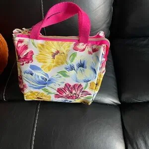This cheerful tote from Kate Spade features a vibrant floral design in pink and yellow, perfect for adding a pop of color to your day. Crafted from lightweight fabric, it offers a stylish and functional option for casual outings.New lunch bag.