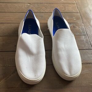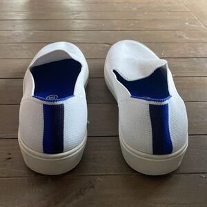 Stylish white flats with blue accents. Comfortable and versatile design.