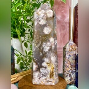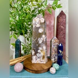 This listing is for a large Black Flower Agate crystal tower that is 6-1/4 inches tall. The tower is a mix of dark and light gray Agate with "flower" inclusions of pink, white and ivory. There are also a few sections of sparkling Quartz and a Quartz druzy pocket. The agate is so clear in certain areas that you can see the depths of the tower.