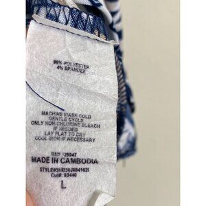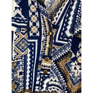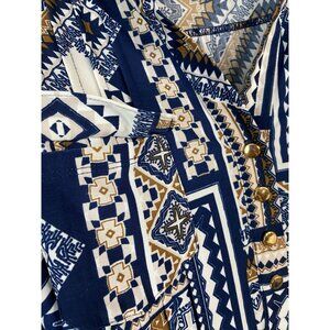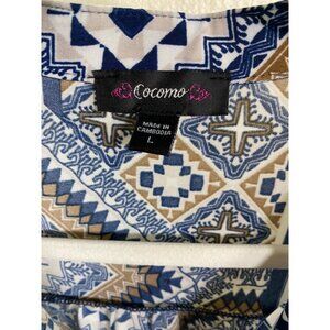 Cocomo Top Women Size Large Blue White Geometric Blouse Stretch 3/4 Sleeves Button Accents