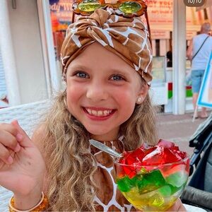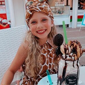 Charming giraffe print dress with matching hat. Features a playful design and comfortable fit.