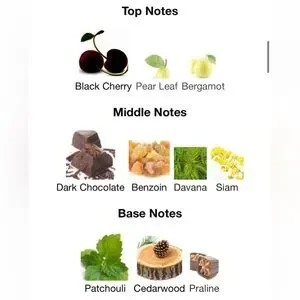 It's Cherry and dark chocolate in the opening at first spray surprisingly dries down within minutes into a fruit vanilla fresh combo. It's a more airy fresh version of YLS Opium Over Red. Sexy and exotic fragrance. Very long lasting.
