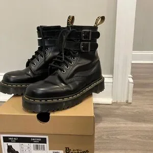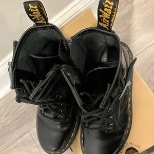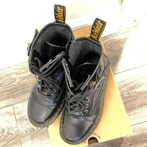 Stylish black leather boots with buckle detail. Iconic yellow stitching and pull tab.