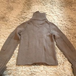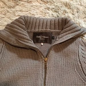 Stylish gray sweater with a zip-up front. Features a cozy collar and ribbed texture. Perfect for layering.