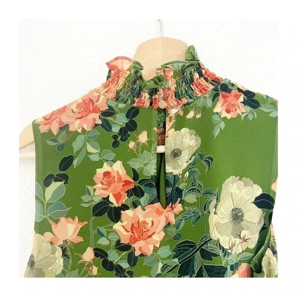 Vince Camuto Floral Sleeveless Smocked Mock-Neck Blouse. Pull over style, high neck with two button closure on back, sleeveless, and lined. Green coloring a colorful floral design throughout. Size extra small.