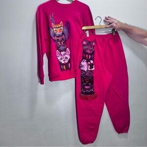 VIntage Tultex Hand Painted Cats Sweatsuit Sweatshirt Pants Pink Size XL