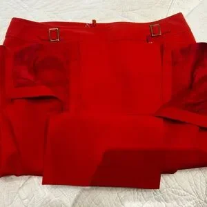 This knee-length coral pencil skirt by Escada features a sleek, tailored silhouette with gold-tone hardware accents. Its structured fabric ensures a form-fitting look, making it ideal for professional settings. Fabric is really soft and comfortable. It’s fully lined. Excellent used condition. Definitely eye catching.