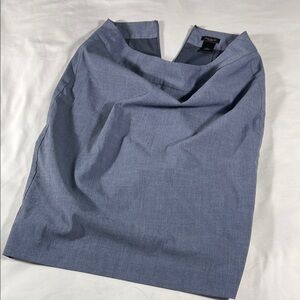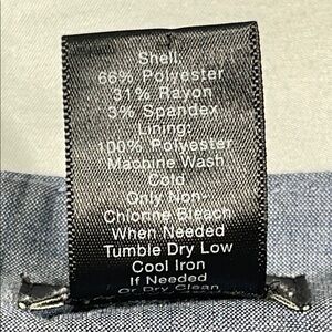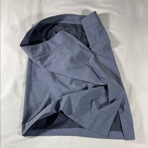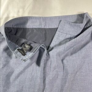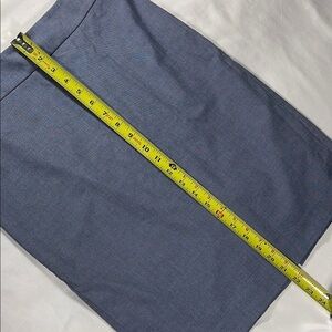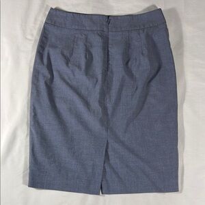 Excellent condition, 66% polyester 31% rayon 3% spandex, light blue/grey knee length pencil skirt, no pockets, rear zip opening and bottom slit (pictured), 28” waist, 21.5” length