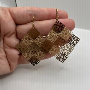 These gold tone metal earrings showcase an intricate geometric design with a delicate filigree pattern, creating a lightweight and lacy appearance. The ornate cutout pattern is inspired by Moroccan aesthetics, making them a striking statement piece. Measuring 1 3/4 x 2 inches, they hang elegantly from simple hook-style ear wires. Pre loved and in EUC. Unknown brand.
