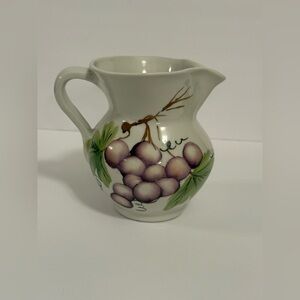 This Italian vintage pottery pitcher features a white base with a hand-painted grape design, showcasing a floral pattern.