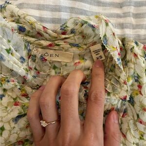 This is a popular style from a few seasons back. 100% silk in the colorway yellow Victorian. This is a very delicate, light blouse with pin tucking details , puffed and ruffled sleeves, and the tiniest hidden snaps down the front. The silk is almost diaphanous.