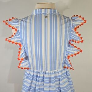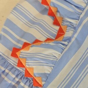 Chic blue striped blouse featuring playful tassels and vibrant orange accents. Perfect for a stylish look. Split neckline with tassel ties, ruffle detail, 100% cotton & side zipper. Great condition pre-owned. See photos for details.