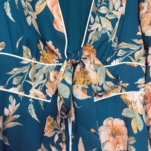 Elegant lightweight floral dress with long sleeves, perfect for any occasion. Features a beautiful floral pattern on a green background. With a beautiful waistline with bow accent.