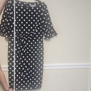 Chic and stylish black and white polka dot dress with a flattering tie waist. Perfect for any occasion.