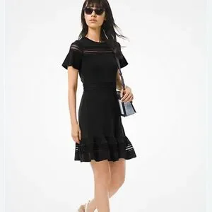 This chic black a-line dress by Michael Kors is perfect for an any occasion that calls for a little black dress. It features a crew neck, mesh insets and short flutter sleeves, as well as a flounce mini hem offering a sleek and sophisticated silhouette with feminine charm in a comfortable crepe jersey stretch fabric.