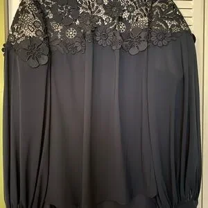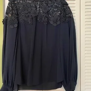 Elegant navy top with intricate floral lace detailing. Long sleeves with a flowy fit. Perfect for a sophisticated look.