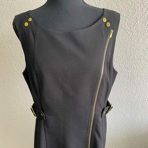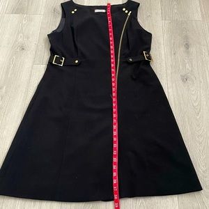 Elegant black midi dress by Calvin Klein. Features stylish gold zipper and buckle details. Perfect for any occasion.