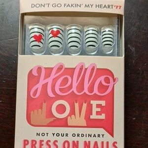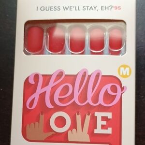 Set of four Hello Love press on nails. Includes various designs in pink, red, and gold.
