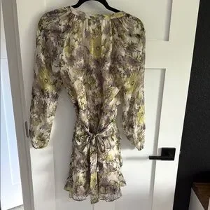 Embrace elegance with this stunning floral V-neck dress. Featuring a beautiful blend of yellow and purple hues, this dress is perfect for any occasion. The lightweight fabric and flattering fit ensure comfort and style.