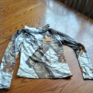 Long sleeve top with camo and pink accents. Features a half-zip design. Clean, signs of wear on pink accents.