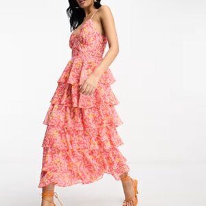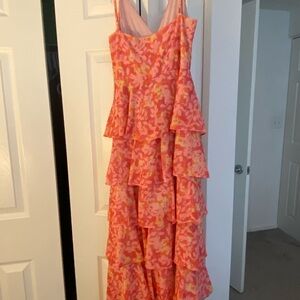 Stunning tiered dress in vibrant pink and orange. Perfect for a wedding guest look! Only worn once to a wedding and has been washed. In excellent condition.