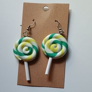 Set of colorful lollipop earrings. Features swirl designs in various colors. Fun and playful accessory.