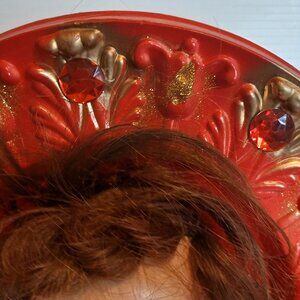 I mounted a vintage plastic doll head through the hole of a ceiling medallion. I spray-painted the medallion red and added gold paint, gold glitter, and red rhinestones. I spray-painted the back of the medallion with black spray paint, circling around the doll's head, letting it drip to create a creepy effect.